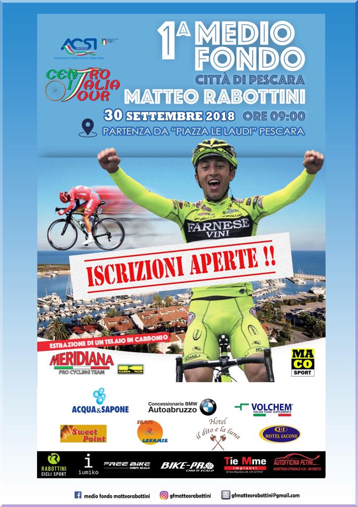 Domenica si correrà la prima edizione della medio fondo Matteo Rabottini. Il via alle 9 da Piazza Le Laudi a Pescara. Percorso di 111 km verso Loreto Aprutino e Penne. Tantissimi gli amatori previsti al via che pedaleranno al fianco del vincitore della tappa del giro d’Italia di Pian dei Resinelli. La manifestazione sarà valida come prova del Campionato nazionale GF Acsi ciclismo 2018
