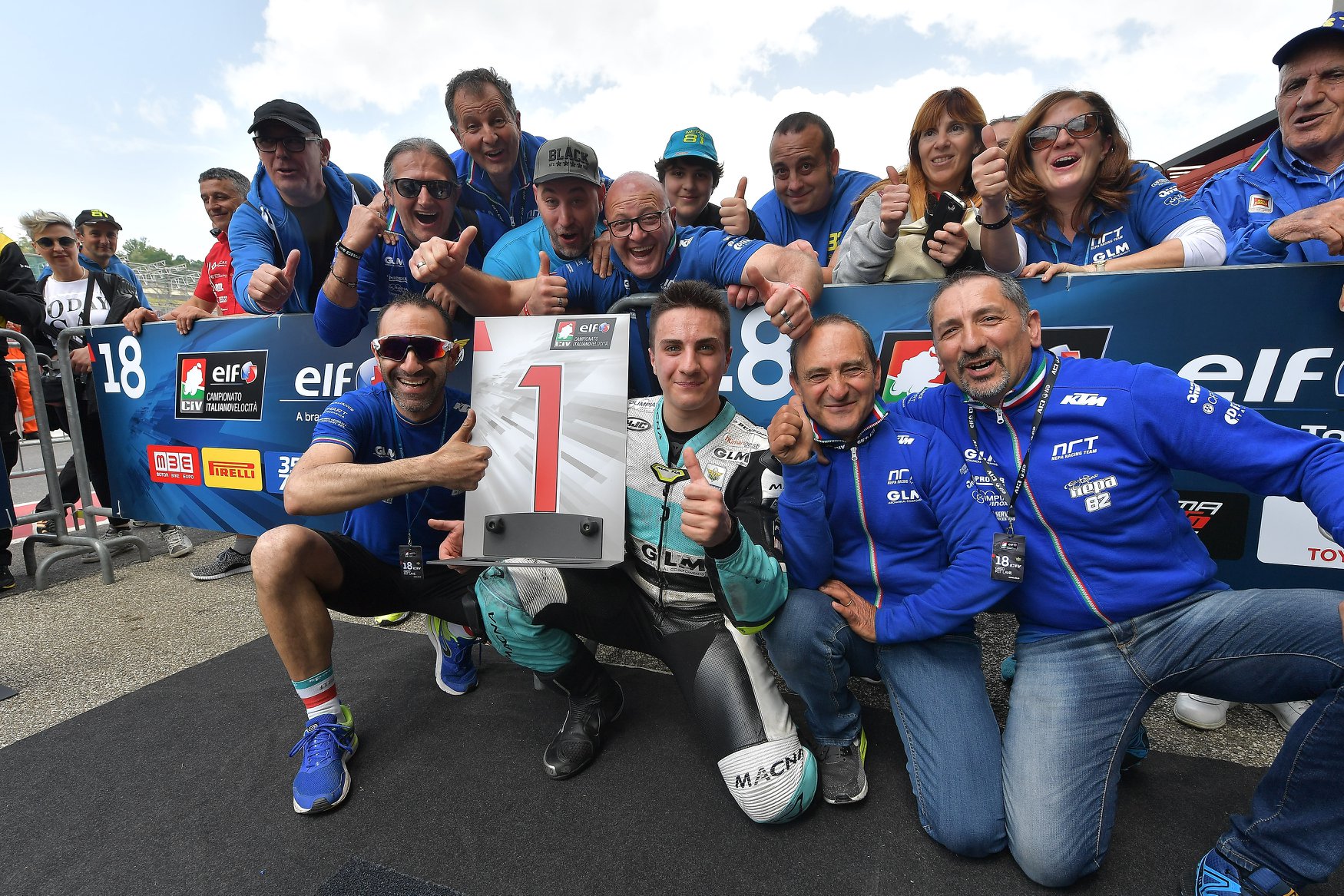 Stefano Nepa ritorna in sella e lo fa alla sua maniera. Il giovane talento abruzzese di Cologna Spiaggia, ha stravinto la gara del Mugello di sabato infliggendo distacchi abissali ai suoi avversari, oltre 9,5 sec. Poco più di un mese fa, durante la gara del CEV Mondiale Junior Moto3, è stato vittima di una rovinosa caduta che gli ha procurato la frattura del malleolo tibiale. Nonostante la gravità dell’infortunio, Nepa è rientrato alle competizioni a tempo di record, dopo soli 28 giorni, e lo scorso weekend all’Elf CIV al Mugello si è reso protagonista di un’altra eccellente performance che arricchisce il suo già cospicuo palmares. In Gara1 del sabato, scattato dalla terza casella in griglia, conquista la testa della corsa dopo poche curve e a suon di giri veloci, accumula un vantaggio massimo di quasi 11 secondi dal primo gruppo di inseguitori. Il passo gara mostrato è simile a quello che lo scorso anno gli ha permesso di vincere per ben tre volte durante la stagione, sempre per distacco. In Gara2 della domenica, parte più cauto e per metà gara finisce nella classica bagarre del primo gruppo. Dopo 6 giri, prende la testa della corsa e comincia a martellare un passo gara che, a poco a poco, fa staccare quasi tutti gli avversari. Restano i soli Rossi e Spinelli del Gresini Team a tenergli testa a pochi secondi. Nel corso dell’ultimo giro avviene il ricongiungimento con i due inseguitori e nella successiva volata finale, Stefano Nepa è secondo al fotofinish a soli 54 millesimi .