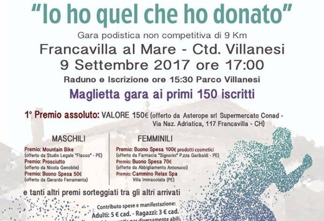 Sabato pomeriggio a Francavilla al Mare è in programma la 1^ edizione de “La Corsa del Donatore – Io ho quel che ho donato”, gara non competitiva di 9 Km aperta a tutti, con finalità sociali-educative. Raduno e iscrizioni alle 15.30 a Parco Villanesi; partenza della gara alle 17.00. La manifestazione, inserita nel programma dei festeggiamenti della Madonna delle Grazie, prevede oltre alla gara podistica, anche interventi di personalità del campo medico-scientifico allo scopo di propagandare la cultura della donazione degli organi e della prevenzione delle nefropatie.