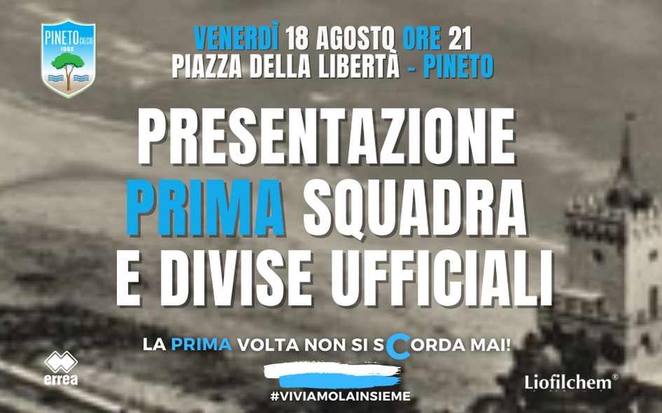 Venerdì 18 agosto alle ore 21 in Piazza della Libertà a Pineto saranno presentati squadra e staff del Pineto Calcio e nell’occasione saranno svelate anche le divise ufficiali che accompagneranno i biancazzurri nel primo campionato di serie C