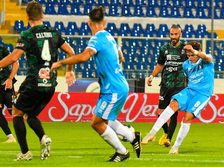 Cudini sceglie un 3-4-3 con Fabrizi punta centrale, 3-5-2 per gli ospiti che cercano di allungare proprio sui biancazzurri in classifica. Vantaggio nel primo tempo con il centro di Italeng dopo appena 5′ per gli ospiti. Cudini inserisce Gambale nella ripresa al posto di Del Sole, per dare più peso all’attacco e trova il pari con un calcio di punizione di Bruzzaniti. Baggi colpisce una traversa clamorosa a poco più di dieci minuti dalla fine. Risultato finale 1-1.