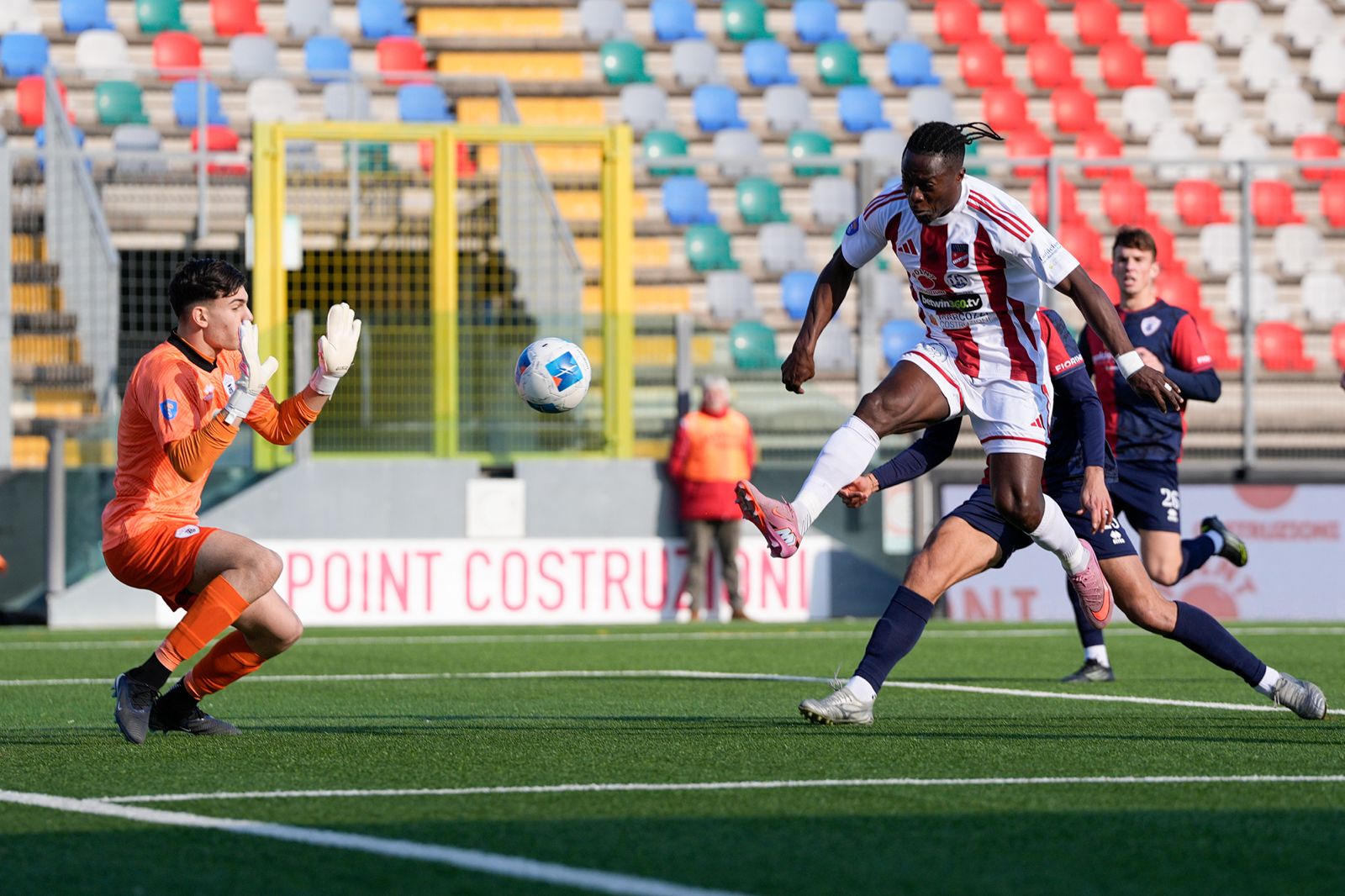 Il Teramo resta con il piede sull’acceleratore e al 17’ cala il tris: Njambe, in stato di grazia, scatta sul filo del fuorigioco, salta la linea difensiva e davanti a Novelli è glaciale. È tripletta personale e 3-0. Al 19’ l’attaccante biancorosso va vicino al poker: servito in campo aperto, supera anche il portiere con una serie di finte, ma Magi Galluzzi salva sulla linea. 31’ Ancora Teramo pericoloso: cross di Angiulli dalla sinistra, Alessandretti svetta di testa ma Novelli blocca.