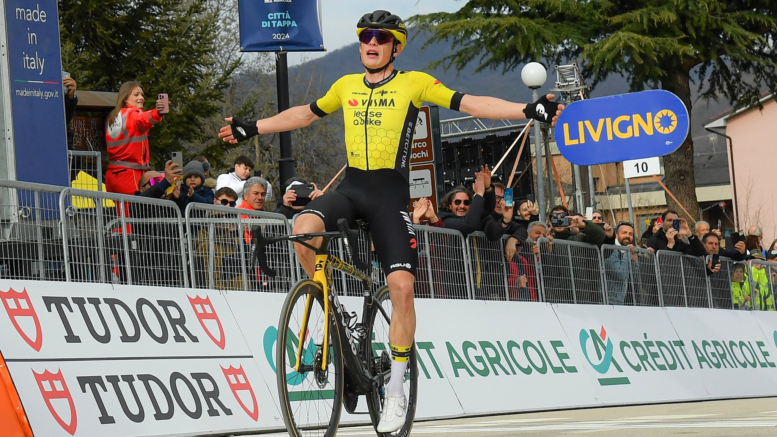 Il vincitore del Tour Jonas Vingegaard si impone di forza sul traguardo di Valle Castellana, nella tappa tutta abruzzese. Assolo imperioso e maglia di leader della Tirreno