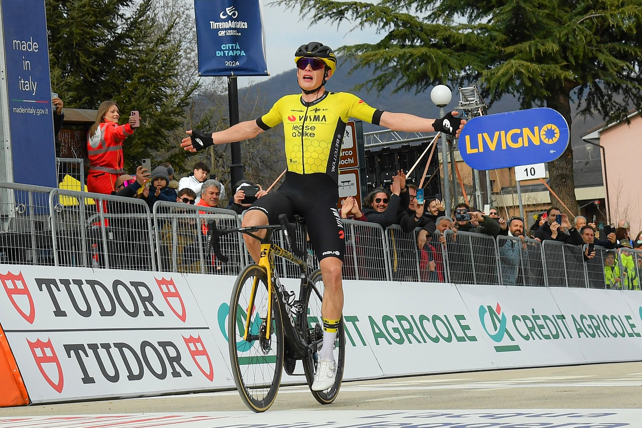 Il vincitore del Tour Jonas Vingegaard si impone di forza sul traguardo di Valle Castellana, nella tappa tutta abruzzese. Assolo imperioso e maglia di leader della Tirreno
