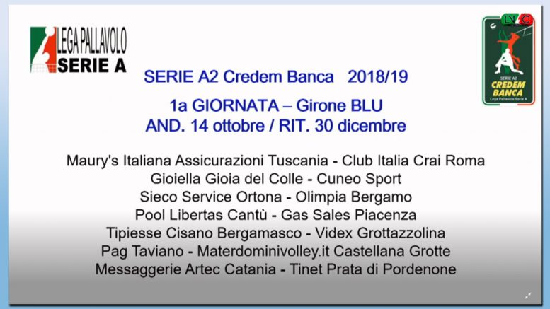 Come d’abitudine, la serie A2 sarà divisa in due gironi, quello denominato “Bianco”, formato da 13 squadre, e quello “Blu” che ne conta invece 14. La Sieco Impavida Ortona è stata inserita nel Blu insieme a: Olimpia Bergamo, Maury’s Italiana Assicurazioni Tuscania, Videx Grottazzolina, Gioiella Gioia Del Colle, Pool Libertas Cantù, Materdominivolley.it Castellana Grotte, Club Italia Crai Roma, Tinet Prata di Pordenone, Tipiesse Cisano Bergamasco, Pag Taviano, Messaggerie Artec Catania, Cuneo Sport, Gas Sales Piacenza. Il campionato partirà il 14 ottobre per concludersi il 31 marzo 2019. La Sieco debutterà in casa contro Bergamo; quindi due trasferte con Grottazzolina e Taviano. Novità della stagione: l’introduzione del cartellino verde. Il giocatore che si autodenuncia per un tocco a muro riceverà un cartellino di quel colore come premio. Alla fine della stagione la squadra e il giocatore che avranno collezionato più cartellini verdi saranno premiati (e il quantum devoluto per un’operazione benefica). La preparazione della Sieco Impavida inizierà il 23 agosto (raduno il giorno prima).