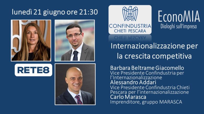 Qual è la situazione delle imprese del nostro Paese e quali le prospettive di crescita sui mercati esteri? Quali i programmi e gli strumenti per la crescita competitiva delle imprese Abruzzesi? Sono i temi di EconoMia, il settimanale di Rete8 condotto da Jenny Viant Gomez, in onda lunedì 21 giugno alle ore 21.
