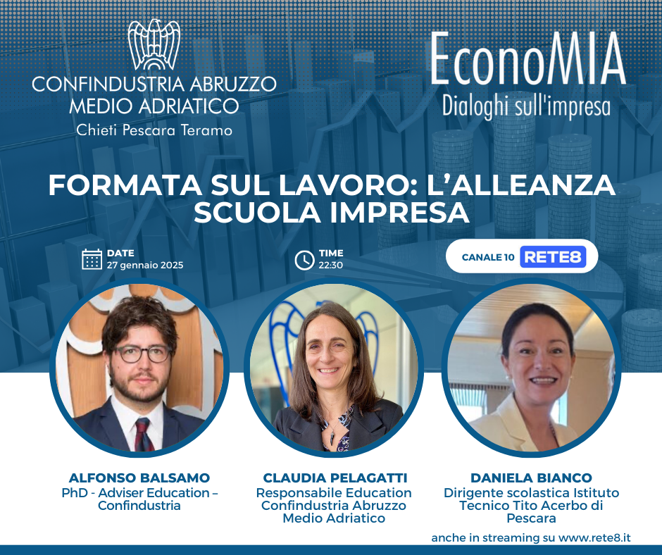 ‘Formata sul lavoro: l’alleanza scuola impresa’: è il titolo della puntata di ‘EconoMIA, dialoghi sull’impresa’, format tv di Confindustria Abruzzo Medio Adriatico e Rete8 che andrà in onda lunedì 27 gennaio, alle ore 22:30, sul canale 10 del digitale terrestre