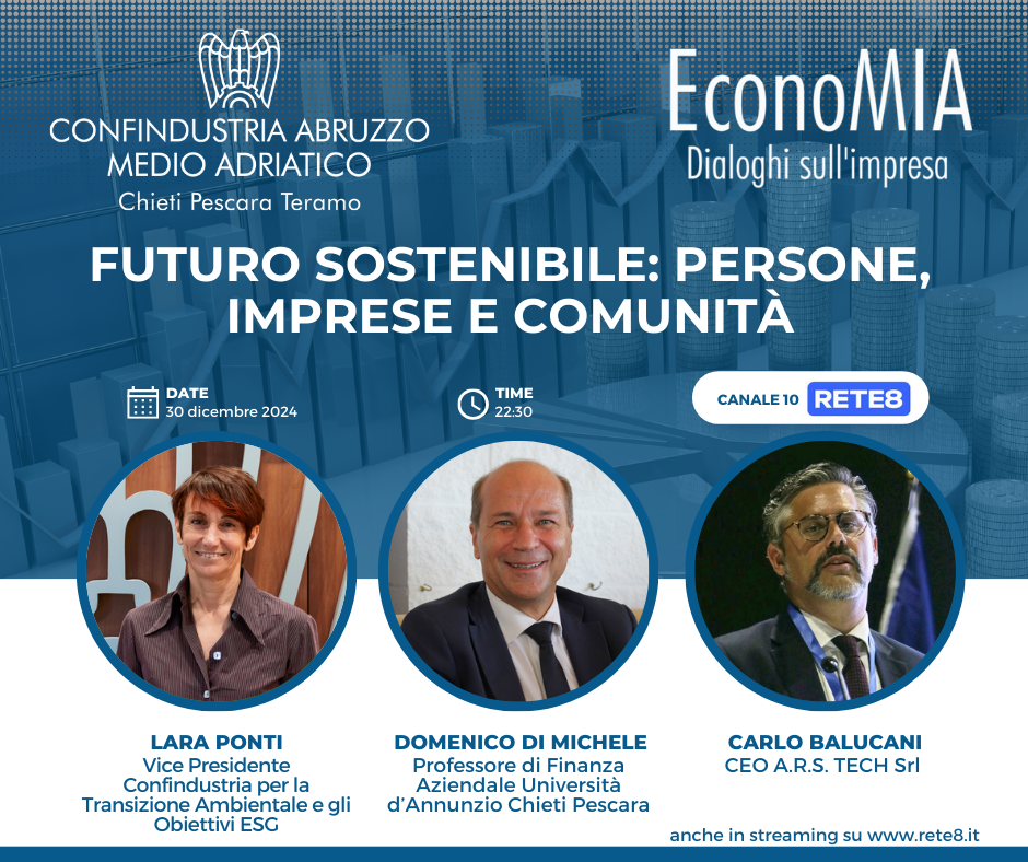 ‘Futuro Sostenibile: Persone, Imprese e Comunità’ è il titolo della puntata di “EconoMIA, dialoghi sull’impresa”, format tv di Confindustria Abruzzo Medio Adriatico e Rete8 che andrà in onda lunedì 30 dicembre, alle ore 22:30, sul canale 10 del digitale terrestre