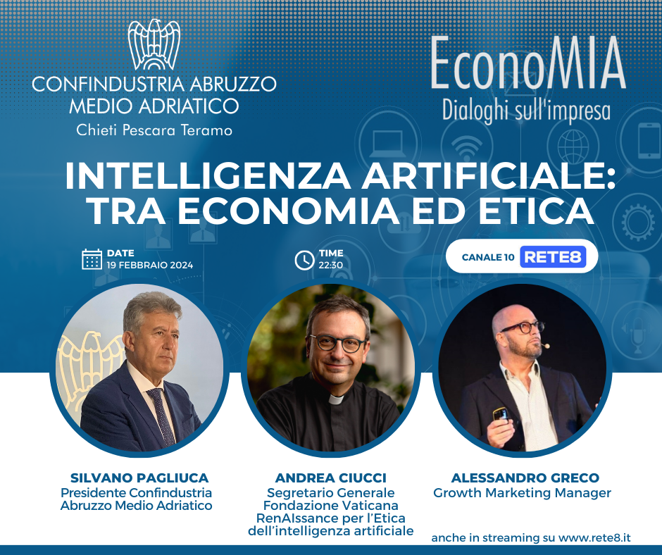 Appuntamento lunedì 19 febbraio alle 22:30 su Rete8 con “EconoMIA, dialoghi sull’impresa” dal titolo: “Intelligenza Artificiale: tra economia ed etica”