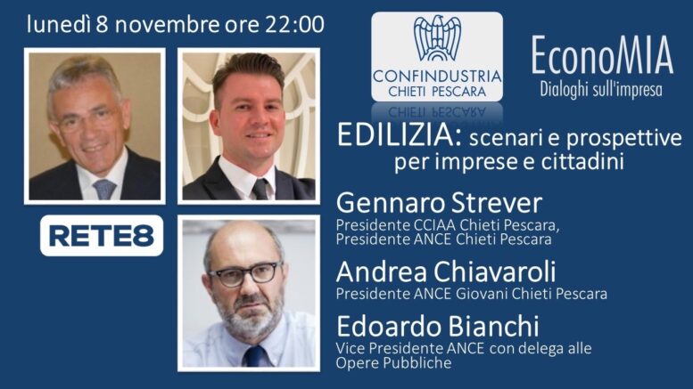 “EDILIZIA, scenari e prospettive per imprese e cittadini”, questo il tema dell’appuntamento di lunedì, 8 novembre alle 22, del format tv “EconoMIA, dialoghi sull’impresa”, collaborazione tra Confindustria Chieti Pescara e Rete8.