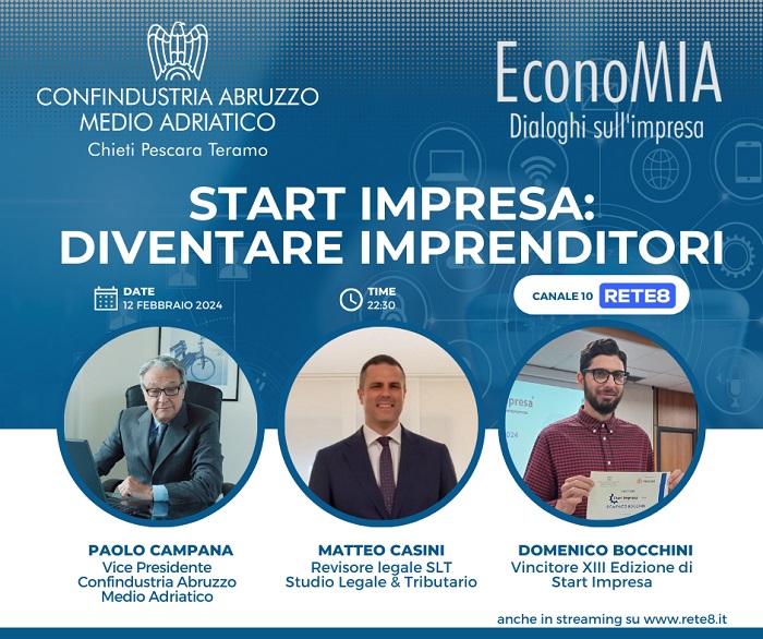 Nuovo appuntamento, stasera, lunedì 12 febbraio, alle ore 22:30 sul canale 10 del digitale terrestre, con “EconoMIA, dialoghi sull’impresa”, format TV di CONFINDUSTRIA Abruzzo Medio Adriatico e RETE8 con la sedicesima puntata della IV stagione, dal titolo: “Start Impresa: diventare imprenditori”.