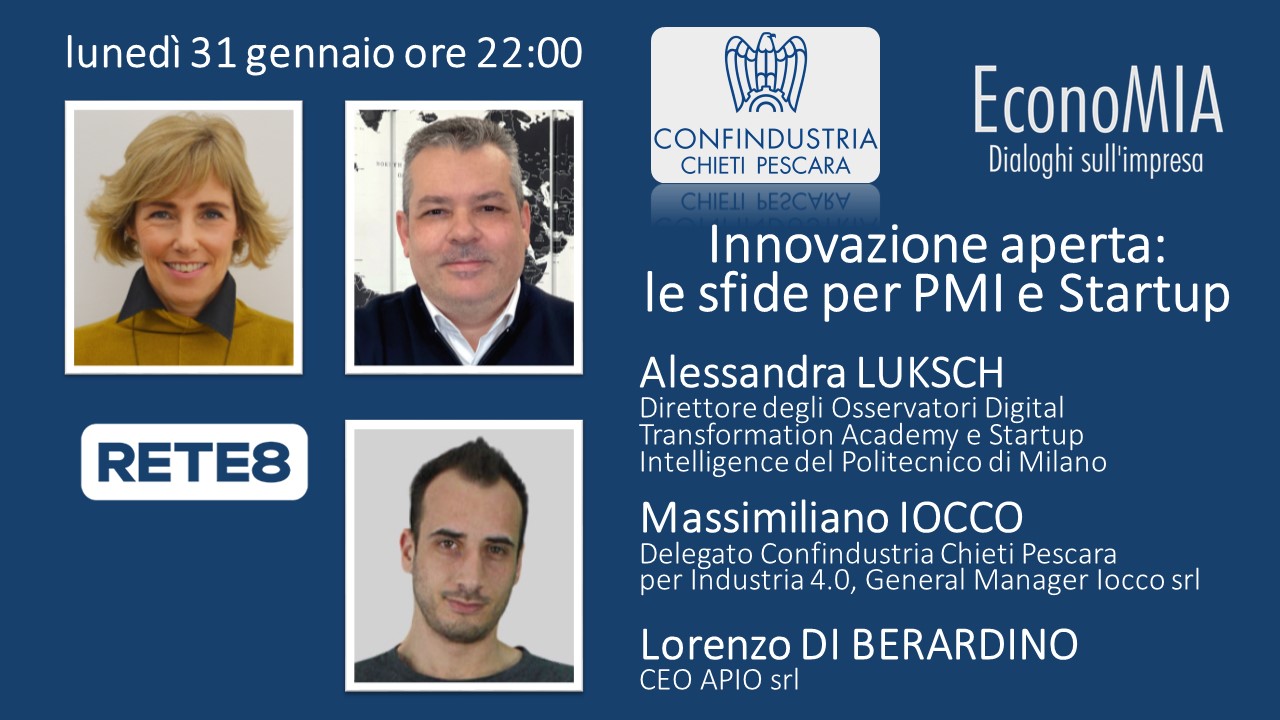 Vi aspettiamo lunedì 31 alle ore 22:00 ad “EconoMIA, dialoghi sull’impresa”, format tv di Confindustria Chieti Pescara e Rete 8, con una nuova puntata dedicata al tema “Innovazione aperta: le sfide per PMI e Startup”.