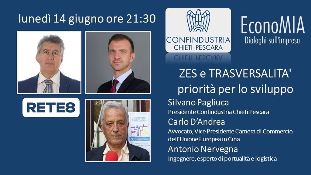 Silvano Pagliuca, presidente Confindustria Chieti Pescara, l’avvocato Carlo D’Andrea, Vice Presidente Camera di Commercio dell’Unione Europea in Cina, e Antonio Nervegna, ingegnere ed esperto di portualità e logistica si confronteranno a partire dalle 21:30 sul tema della trasversalità nell’ambito delle ZES ossia Zone Economiche Speciali. Analisi e approfondimenti sul ruolo dell’Abruzzo parte di una ZES intesa come regione geografica dotata di una legislazione economica differente dalla legislazione in atto nella nazione di appartenenza. In queste aree è garantita la possibilità di derogare dalle leggi vigenti nell’ambito delle ordinarie politiche nazionali.