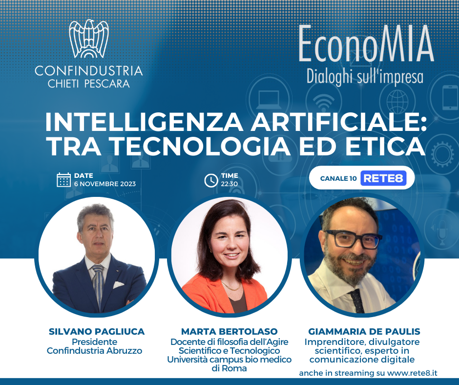 Appuntamento lunedì 6 novembre ore 22:30 al canale 10 del digitale terrestre con “EconoMIA, dialoghi sull’impresa”, format tv di CONFINDUSTRIA CHIETI PESCARA e RETE8 dal titolo: “Intelligenza artificiale: tra tecnologia ed etica”. Ne parleremo con i nostri ospiti: Silvano Pagliuca, Presidente Confindustria Abruzzo; Marta Bertolaso , Docente di filosofia dell’Agire Scientifico e Tecnologico – università campus bio medico di Roma//Professoressa di Filosofia della Scienza e Sviluppo Umano – Università Campus Bio-Medico di Roma; Giammaria De Paulis, Imprenditore, divulgatore scientifico, esperto in comunicazione digitale.