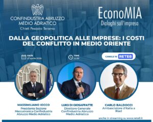 Ne parliamo con Luigi Di Giosaffatte, Direttore Generale Confindustria Abruzzo Medio Adriatico; Massimiliano Iocco, Presidente Sezione Meccatronica di Confindustria Abruzzo Medio Adriatico e fondatore di IOCCO SRL; Carlo Baldocci, Ambasciatore d’Italia a Riad.