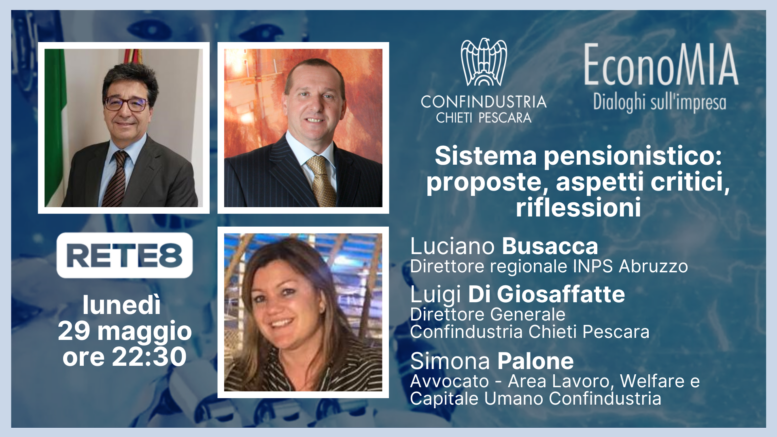 Una puntata dedicata al sistema pensionistico: questo il tema dell’ultima puntata di stagione di #EconoMIA, dialoghi sull’impresa, format tv di Confindustria Chieti Pescara e Rete8, che andrà in onda lunedì 29 maggio 2023 alle ore 22:30