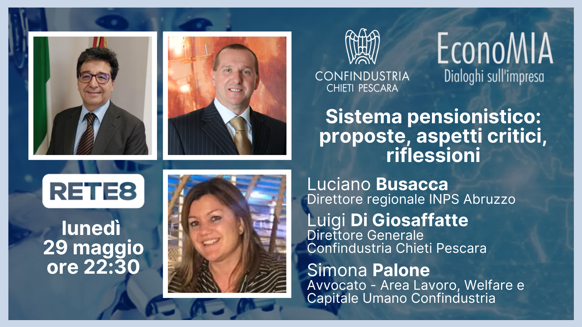 Saranno nostri ospiti: Luciano Busacca – Direttore Regionale INPS Abruzzo ; Luigi Di Giosaffatte – Direttore Generale Confindustria Chieti Pescara; Simona Palone – Avvocato – Area Lavoro, Welfare e Capitale Umano Confindustria. Potrete seguirci in tv su #Rete8, canale 10, oppure in streaming al seguente link: https://lnkd.in/dU7cJJz Le repliche della terza stagione di EconoMIA andranno in onda per tutta l’estate.