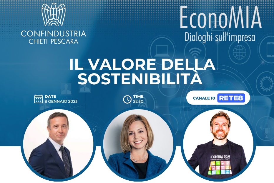 Nuovo appuntamento lunedì 8 gennaio 2024 alle ore 22:30 sul canale 10 del digitale terrestre con “EconoMIA, dialoghi sull’impresa”, format tv di CONFINDUSTRIA CHIETI PESCARA e RETE8 con l’undicesima puntata della IV stagione, dal titolo: “Il valore della sostenibilità”