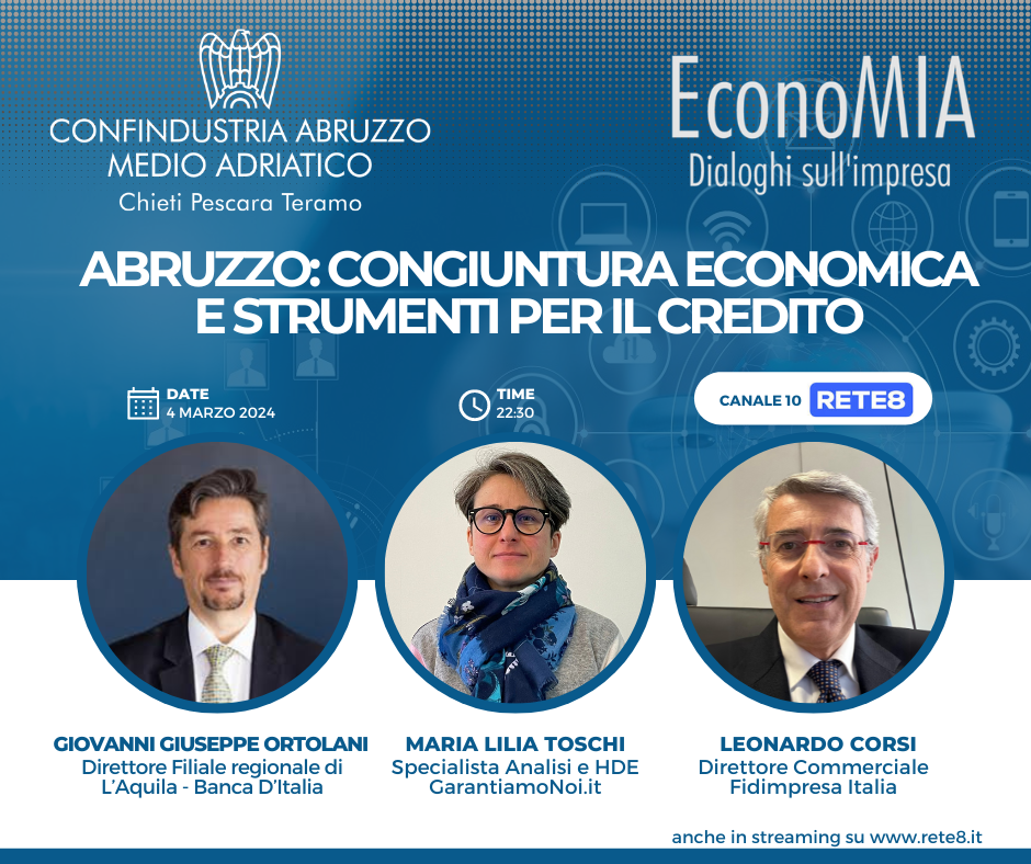 Il format tv di CONFINDUSTRIA Abruzzo Medio Adriatico e RETE8 con la diciannovesima puntata della IV stagione dal titolo: Abruzzo: congiuntura economica e strumenti per il credito. Ci addentreremo nelle dinamiche attuali che stanno modellando l’economia dell’Abruzzo, che deve affrontare sfide globali. Dalla ripresa post-pandemica alle ripercussioni delle tensioni geopolitiche, esploreremo come il territorio sta navigando in un contesto economico in rapido cambiamento. Discuteremo inoltre l’importanza vitale del credito per le imprese, con uno sguardo al sistema dei confidi, essenziale per le piccole e medie imprese nella nostra economia. Nel nostro viaggio, affronteremo non solo la situazione congiunturale dell’economia regionale, ma ci proietteremo anche verso il futuro, analizzando i punti di forza e le aree di vulnerabilità dell’Abruzzo. Guarderemo alle strategie che possono sostenere la crescita sostenibile e l’innovazione, fondamentali per le imprese e per l’intera comunità economica della regione.