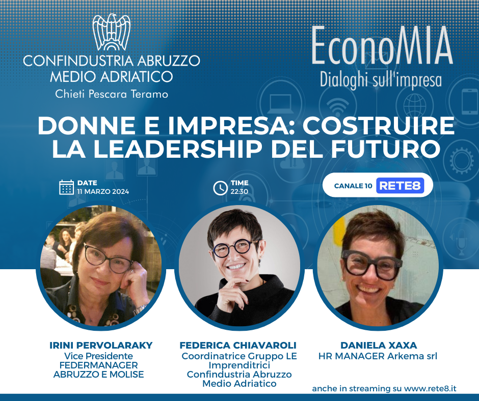 Appuntamento lunedì 11 marzo 2024 ore 22:30 al canale 10 del digitale terrestre “EconoMIA, dialoghi sull’impresa”, format tv di CONFINDUSTRIA Abruzzo Medio Adriatico e RETE8 con la ventesima puntata della IV stagione, dal titolo: “Donne e impresa: costruire la leadership del futuro”