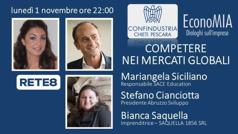 “Competere nei mercati globali: scenari e soluzioni per le imprese”: questo il tema dell’appuntamento di lunedì, 1 novembre alle 22, del format tv “#EconoMIA, dialoghi sull’impresa”, collaborazione tra Confindustria Chieti Pescara e Rete8 .