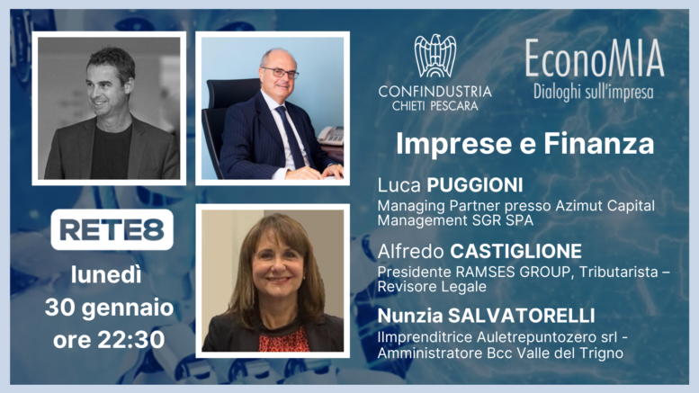 Imprese e finanza: questo il tema della puntata di #EconoMIA, dialoghi sull’impresa, format tv di Confindustria Chieti Pescara e Rete8, che andrà in onda lunedì 30 gennaio 2023 alle ore 22:30