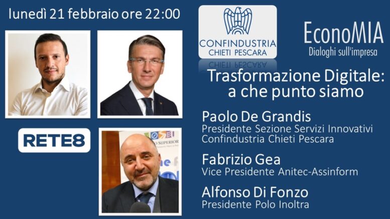 Lunedì 21 febbraio alle ore 22:00 ad “EconoMIA, dialoghi sull’impresa”, format tv di Confindustria Chieti Pescara e Rete 8, con una nuova puntata dedicata al tema “Trasformazione Digitale, a che punto siamo”.