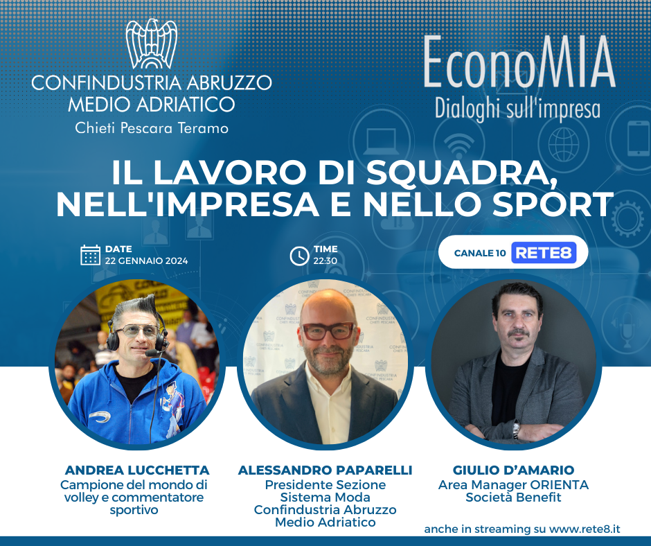 Gli ospiti della puntata saranno Andrea Lucchetta – Campione del mondo di volley e commentatore sportivo; Alessandro Paparelli – Presidente Sezione Sistema Moda Confindustria Abruzzo Medio Adriatico; Giulio D’Amario – Area Manager ORIENTA Società Benefit