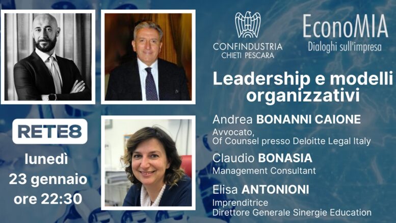 Leadership e modelli organizzativi, questo il tema della puntata di #EconoMIA, dialoghi sull’impresa, format tv di Confindustria Chieti Pescara e Rete8, che andrà in onda lunedì 23 gennaio 2023 alle ore 22:30