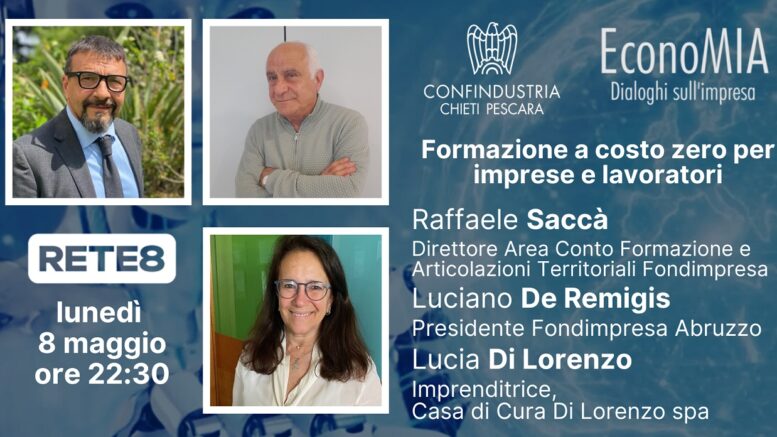 Formazione a costo zero per imprese e lavoratori, questo il tema della puntata di #EconoMIA, dialoghi sull’impresa, format tv di Confindustria Chieti Pescara e Rete8, che andrà in onda lunedì 8 maggio 2023 alle ore 22:30