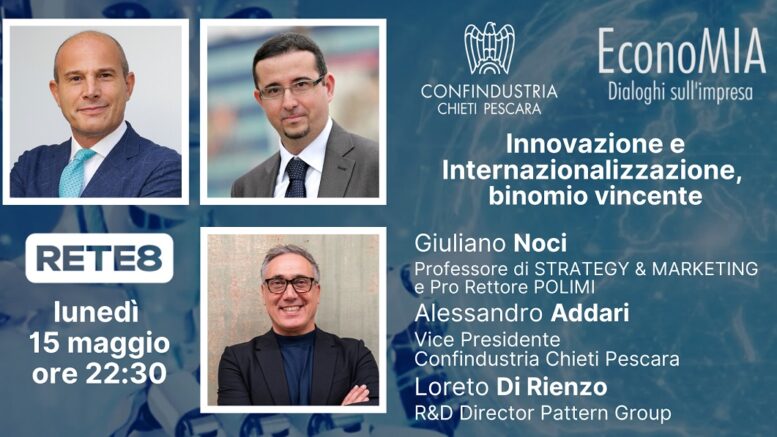 “Innovazione e Internazionalizzazione, binomio vincente”. Questo il tema della puntata di #EconoMIA, dialoghi sull’impresa, format tv di Confindustria Chieti Pescara e Rete8, che andrà in onda lunedì 15 maggio 2023 alle ore 22:30