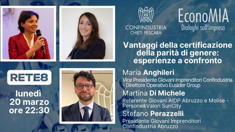 Il “Sistema di certificazione della parità di genere”, è il tema della puntata di #EconoMIA, dialoghi sull’impresa, format tv di Confindustria Chieti Pescara e Rete8, che andrà in onda lunedì 20 marzo 2023 alle ore 22:30