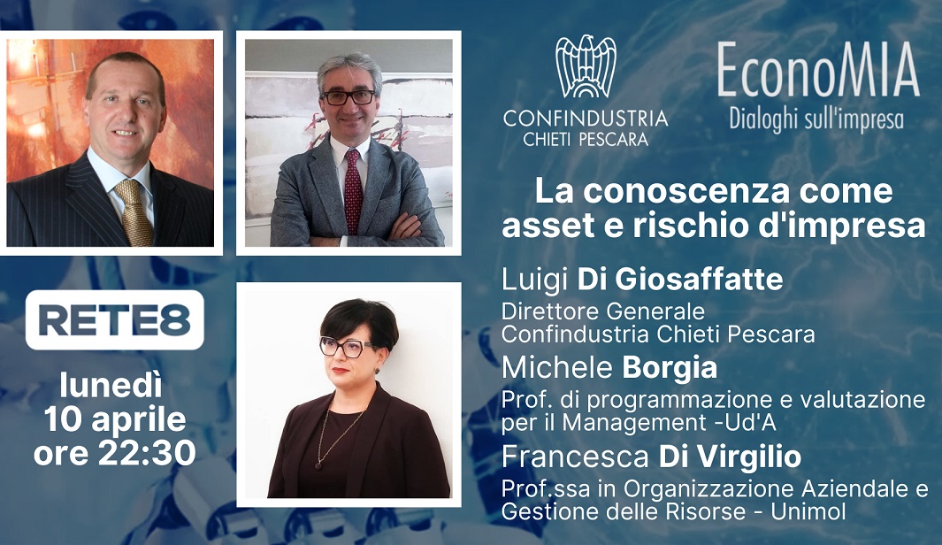La conoscenza come asset e rischio d’impresa. Questo il tema della puntata di #EconoMIA, dialoghi sull’impresa, format tv di Confindustria Chieti Pescara e Rete8, in onda lunedì 10 aprile alle ore 22:45