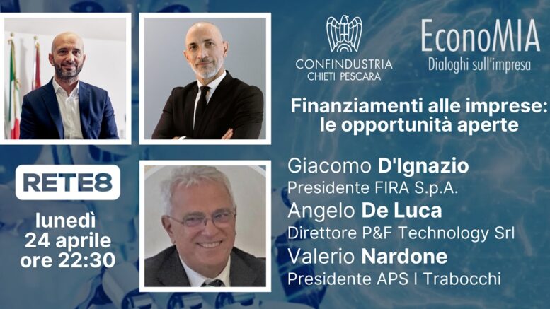 Finanziamenti alle imprese: le opportunità aperte. Questo il tema della puntata di #EconoMIA, dialoghi sull’impresa, format tv di Confindustria Chieti Pescara e Rete8, in onda lunedì 24 aprile alle ore 22:30