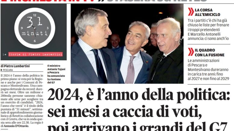 Il 2024 è l’anno della politica in primo piano: si vota per la Regione e anche per i Comuni di Pescara e Montesilvano. Una campagna elettorale da record: durerà sei mesi. Oltre un milione e 200mila persone saranno chiamate alle urne per scegliere tra un esercito di candidati. “2024, l’anno che verrà” è il titolo della puntata di “31 minuti”, settimanale di approfondimento giornalistico di Rete8 in collaborazione con il Centro, che va in onda questa sera alle ore 22.30. La regia è di Antonio D’Ottavio.